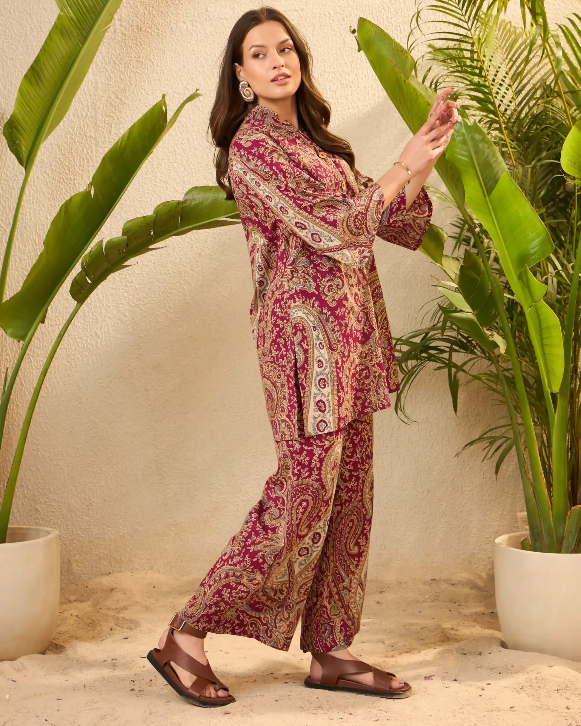 IMANA Maroon Paisley Pure Cotton Mandarin Collar Co-Ord Set