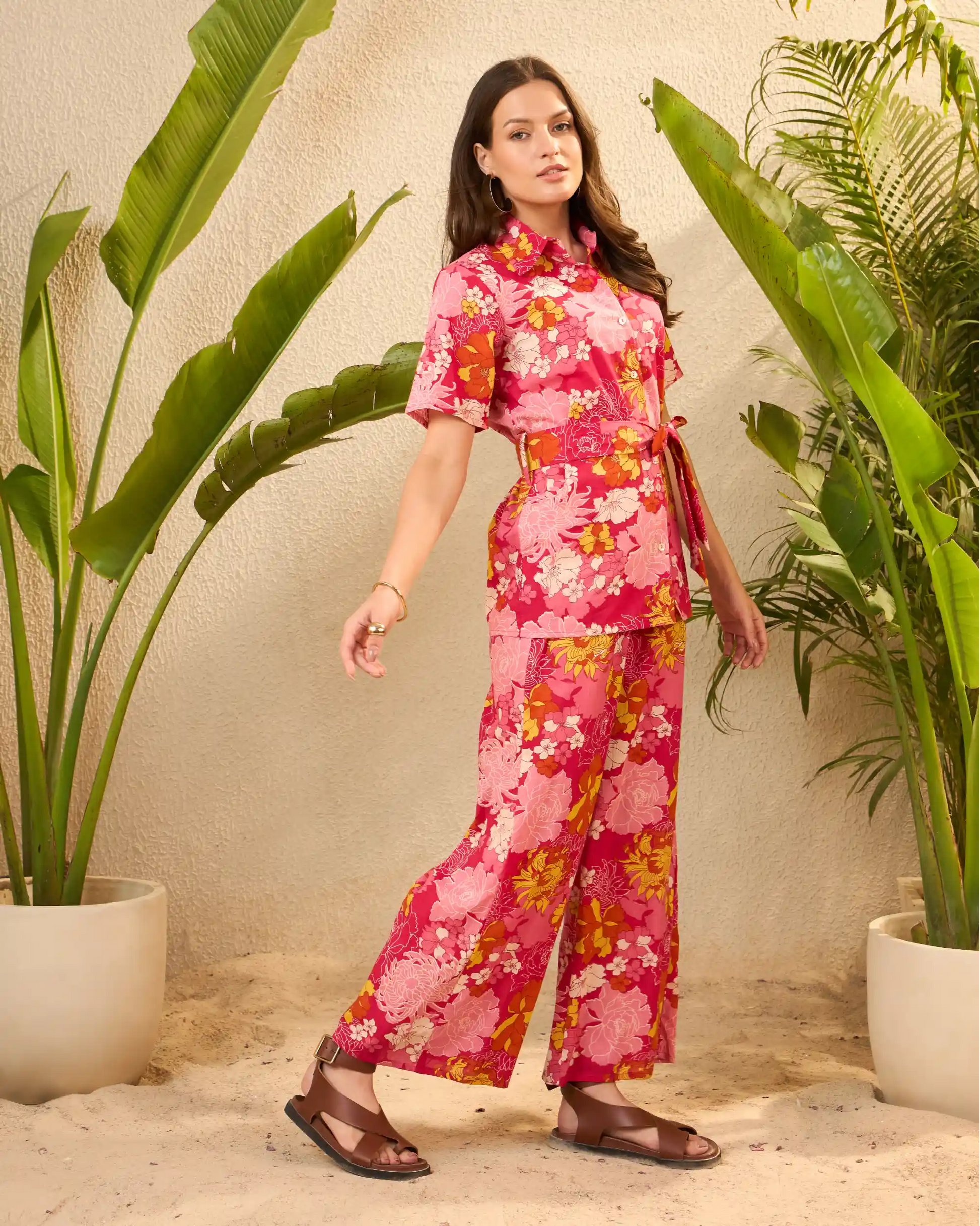 IMANA Pink Floral Printed Pure Cotton Shirt & Trousers Co-Ord Set