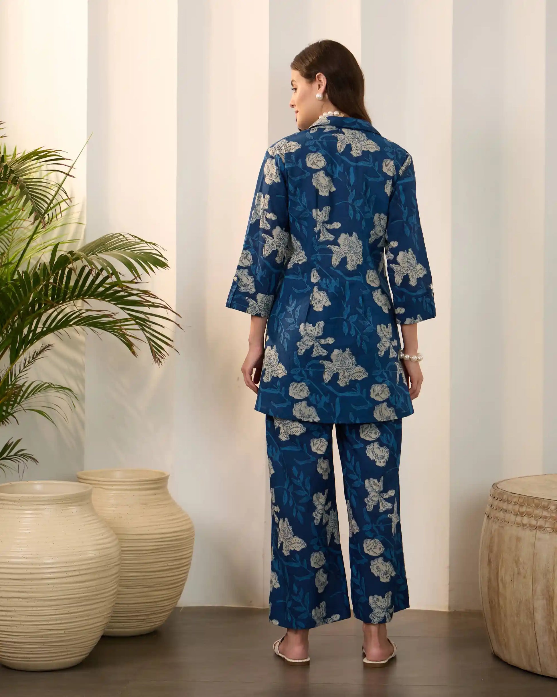 Indigo Blue Floral Pure Cotton Shirt Collar Co-Ord Set