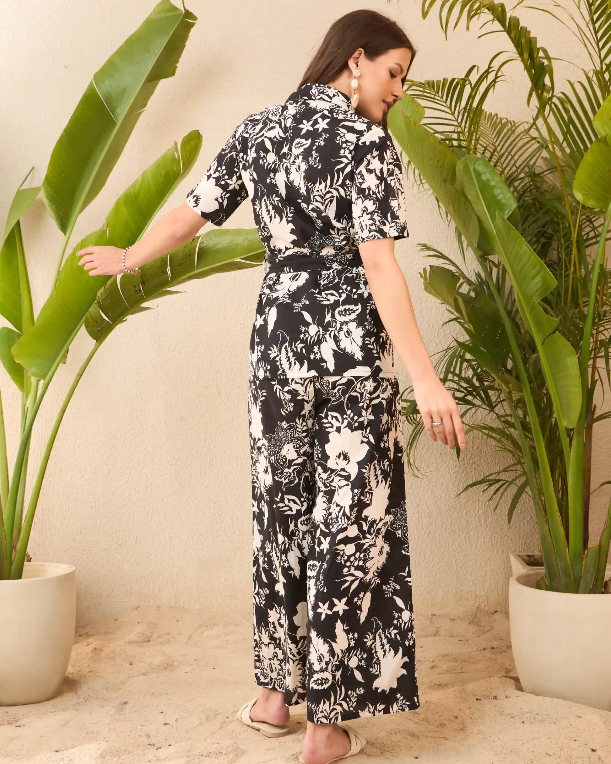 IMANA Black & White Floral Printed Pure Cotton Shirt & Trousers Co-Ord Set