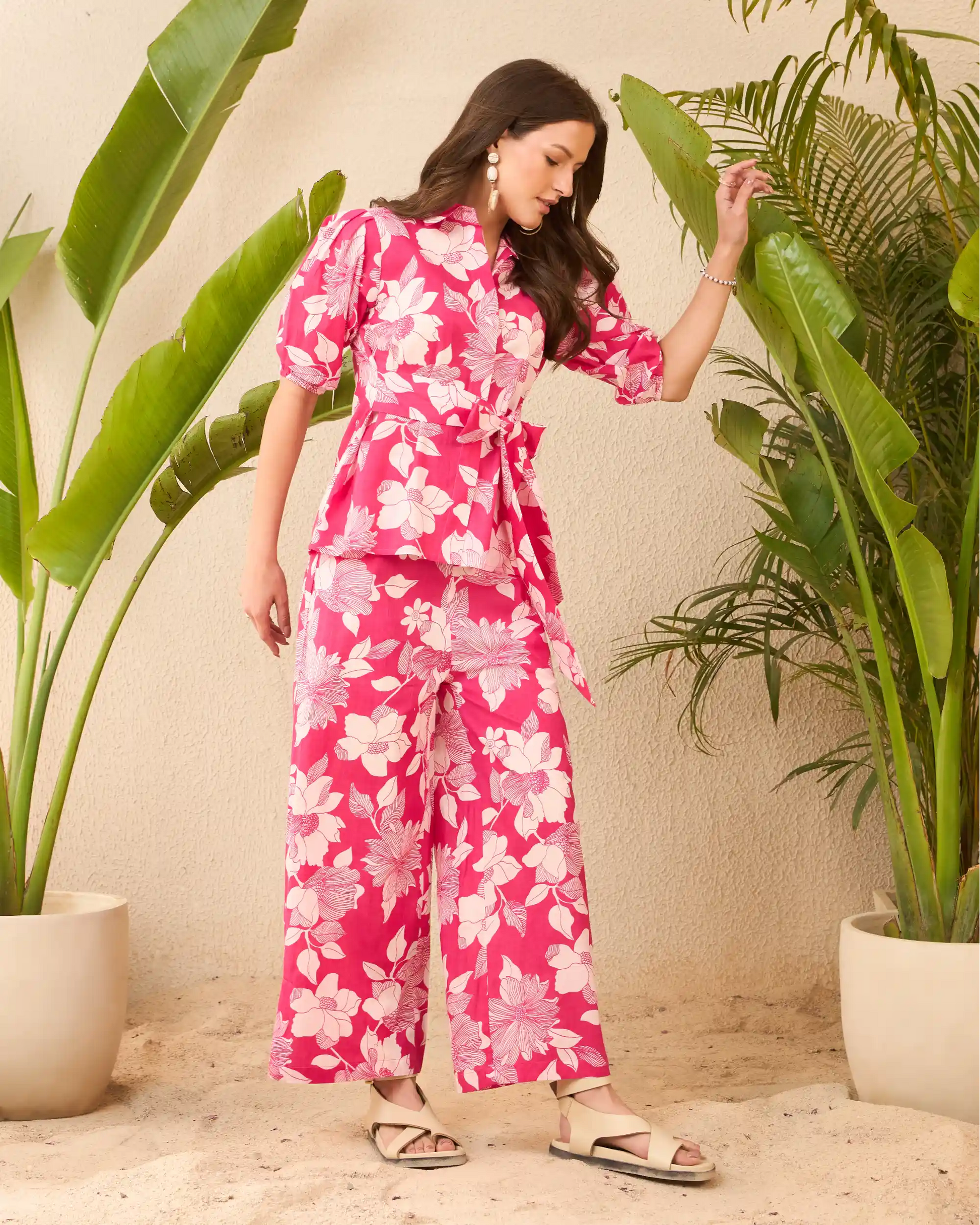 IMANA Pink Floral Printed Pure Cotton Shirt & Wide-Leg Trousers Co-Ord Set