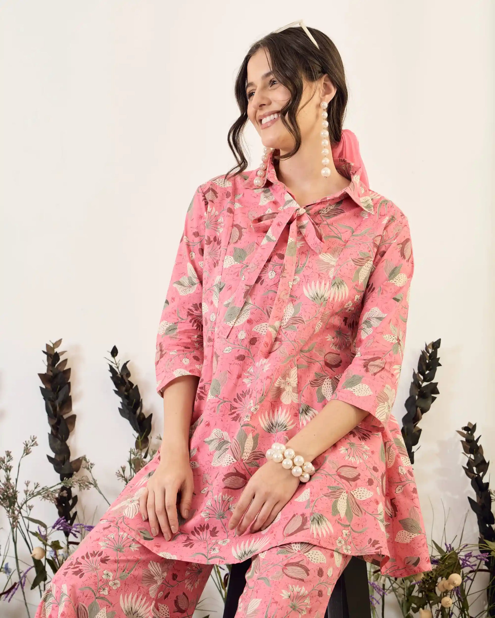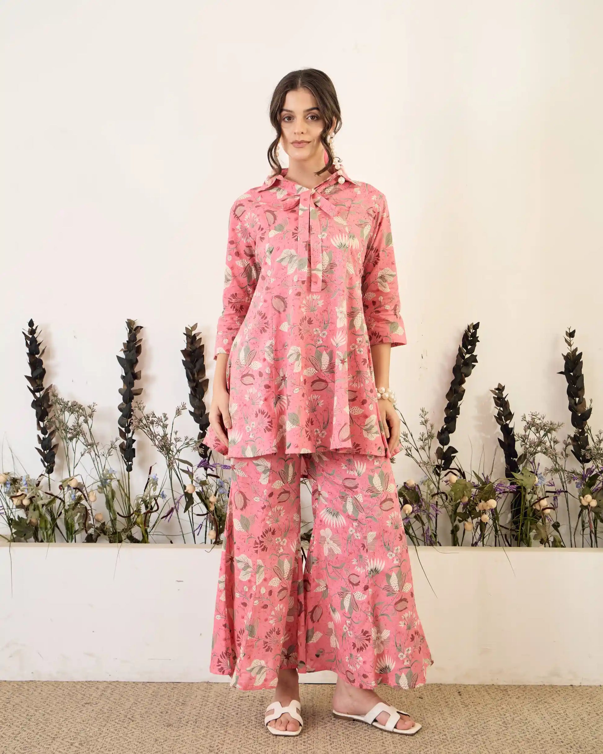 Pink Floral Pure Cotton Collar Neck Tunic & Palazzo Co-Ord Set