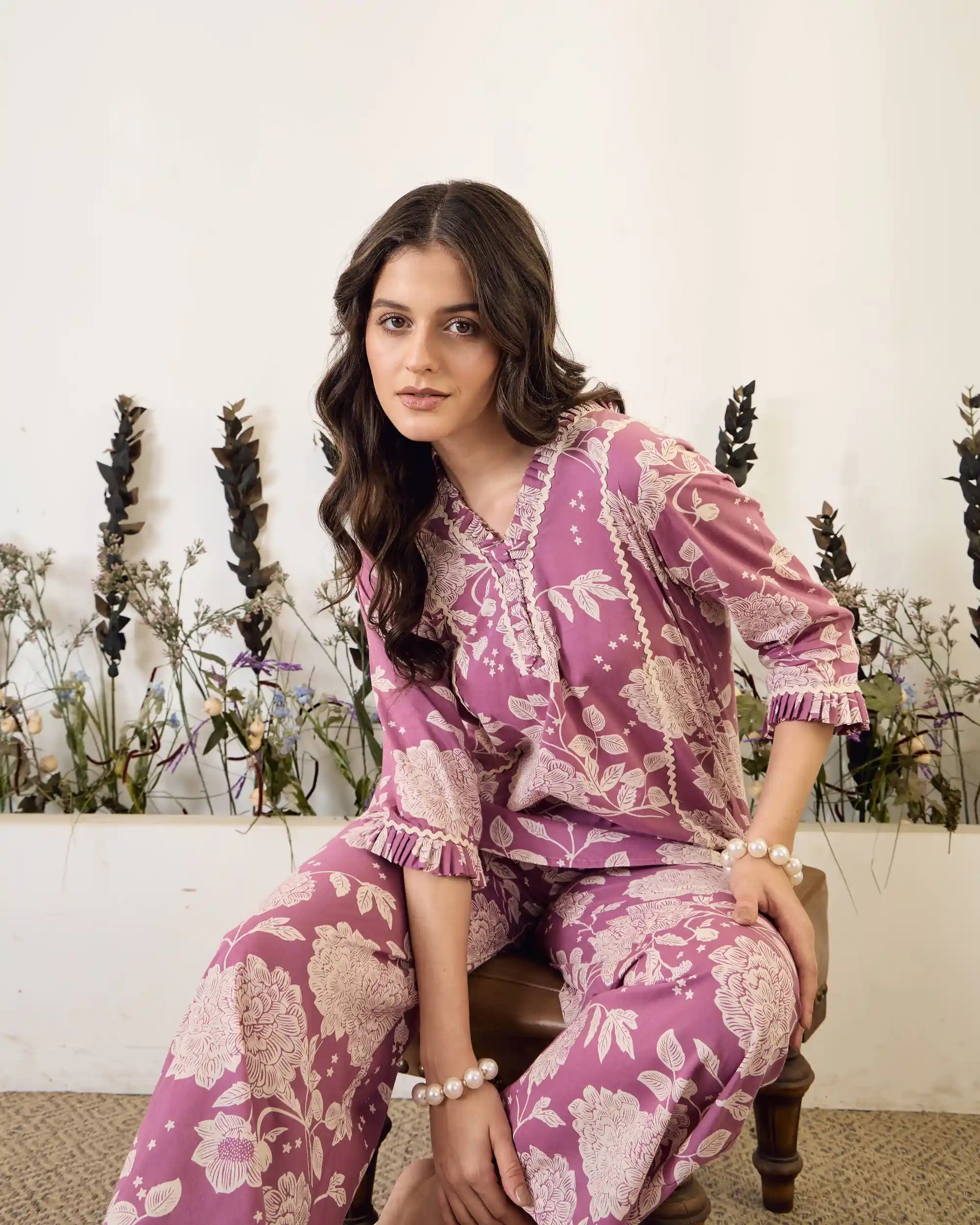 Lavender Floral Pure Cotton V-Neck Top & Trouser Co-Ord Set