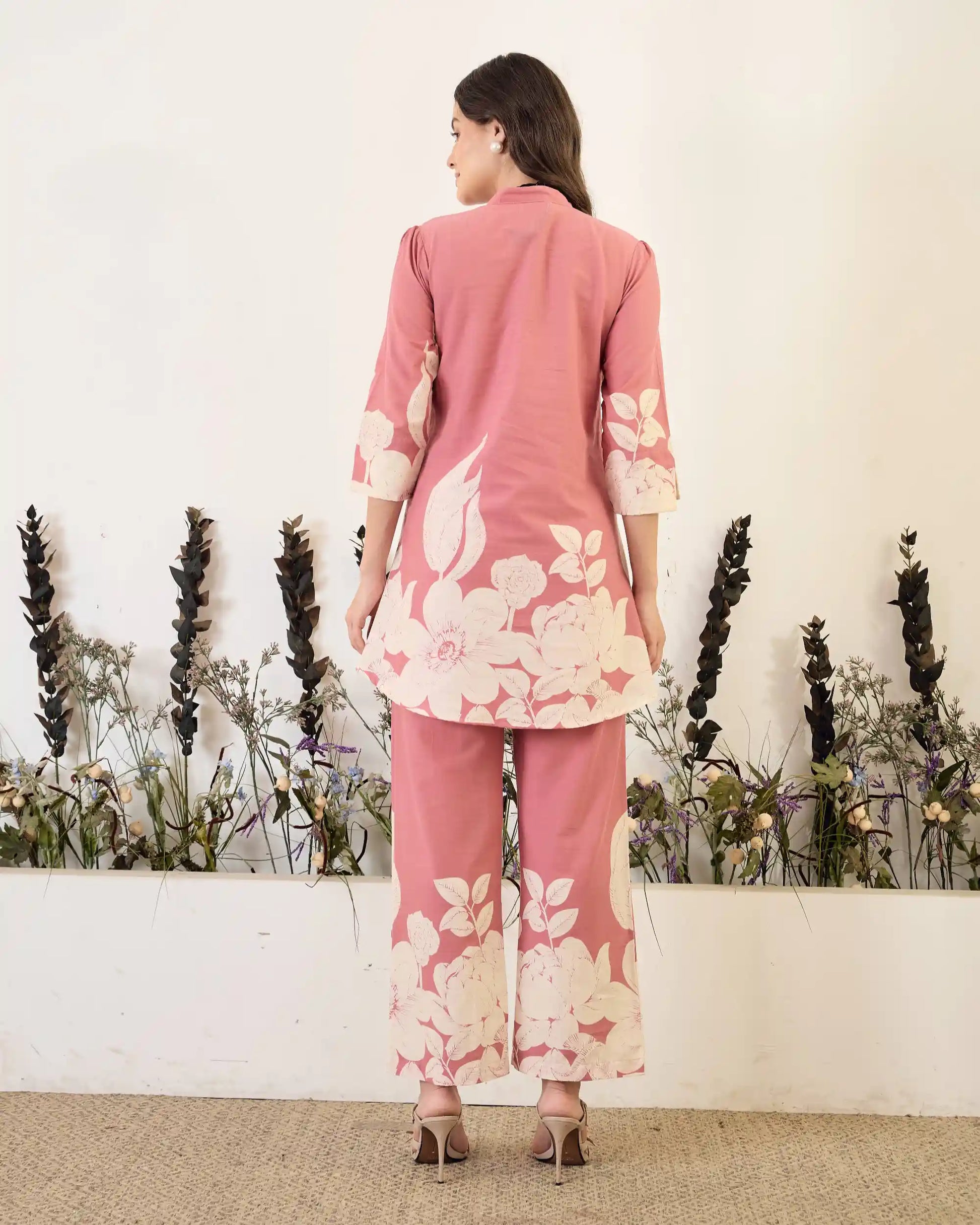 Pink Floral Pure Cotton Mandarin Neck Tunic & Ankle Pant Set