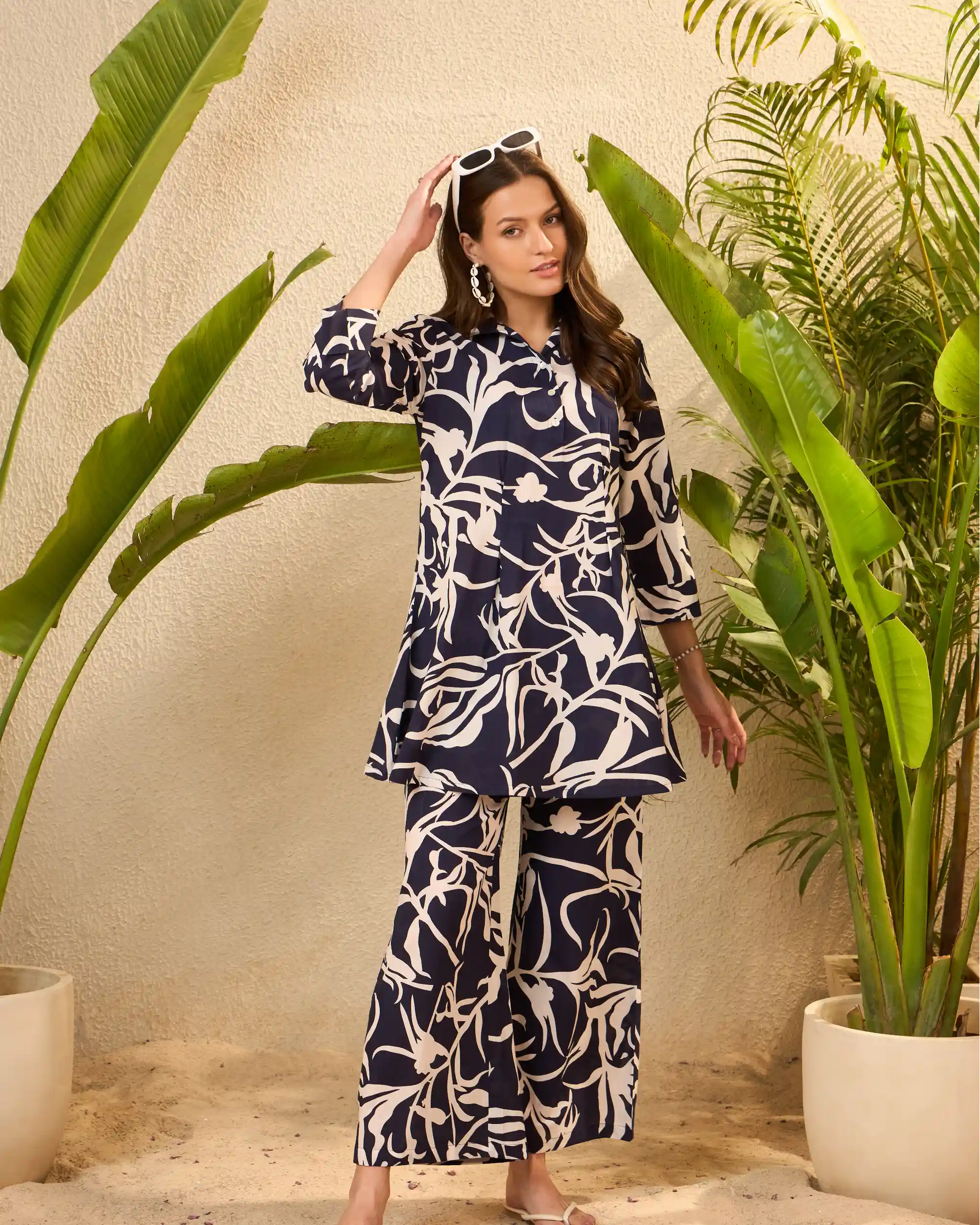 Shirt-collar tunic paired with wide-leg palazzos for effortless movement.